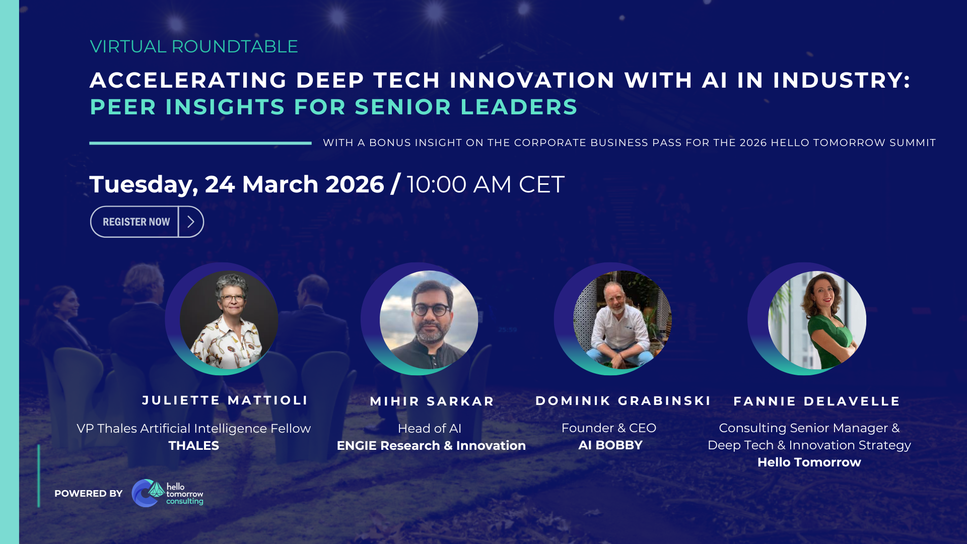 The Corporate Business Pass is a curated 3-hour executive experience on AI in industry, including a private masterclass, tailored startup tour, and peer exchange with corporate leaders facing similar challenges. It will be held at the Hello Tomorrow Summit (11 June 2026, Amsterdam).